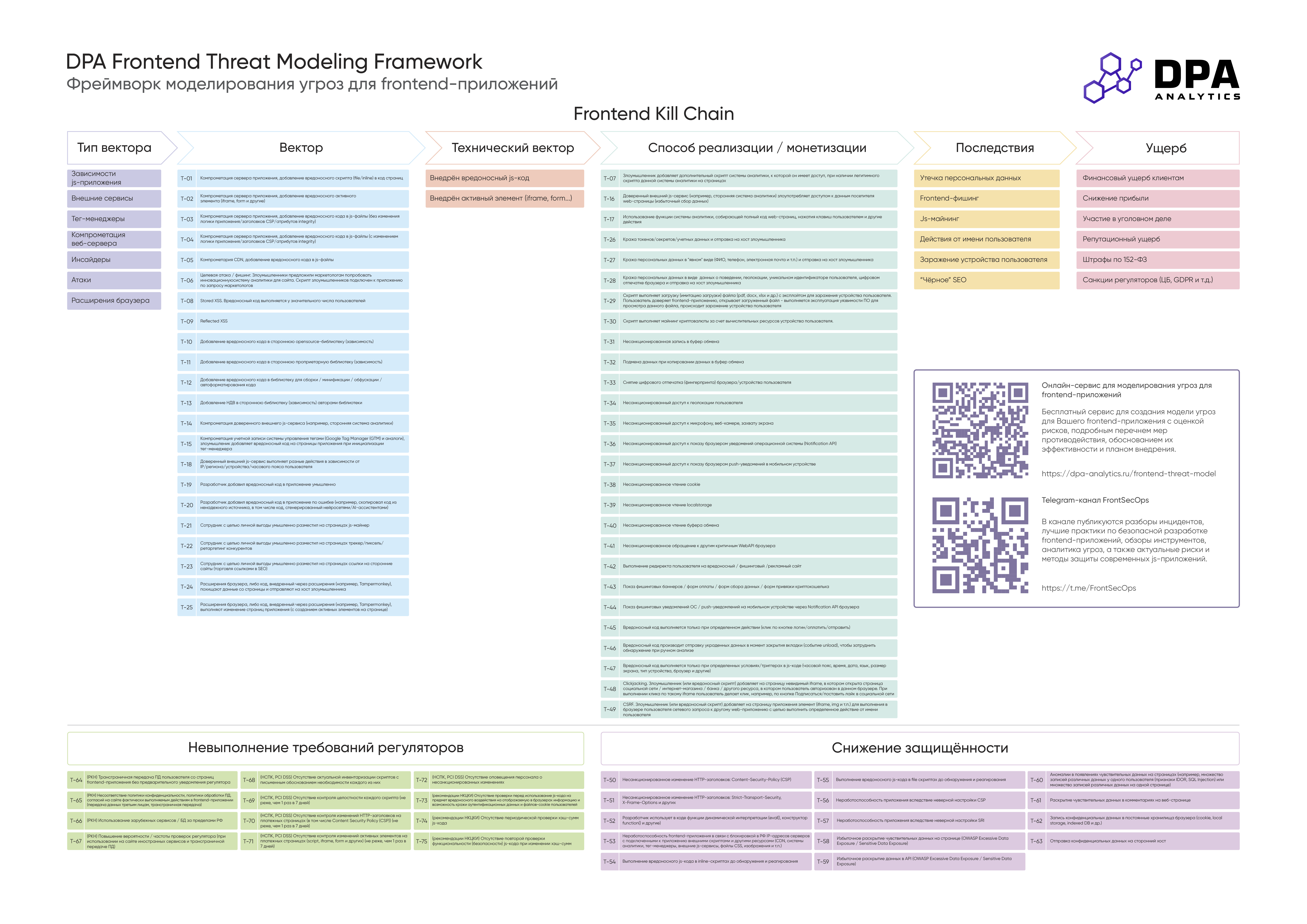 Онлайн-сервис для построения модели угроз для frontend-приложений основан на фреймворке моделирования угроз DPA Analytics (DPA Frontend Threat Modeling Framework). Описание фреймворка и основные сущности были представлены Михаилом Парфеновым в докладе на PHDays 2025 (https://t.me/FrontSecOps/57).